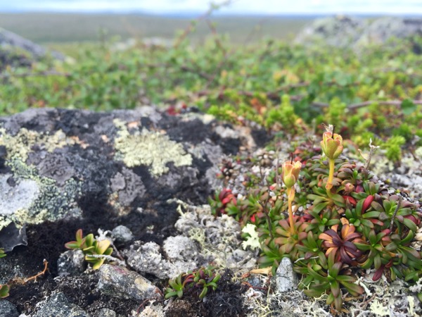 Pitkälle kantavien maisemien lisäksi minua kiehtovat minimaisemat. Tämän asetelman muodostavat jo kukintansa päättänyt tunturikasvi uuvana (Diapensia lapponica) ja kiven pinnassa kasvavat jäkälät.